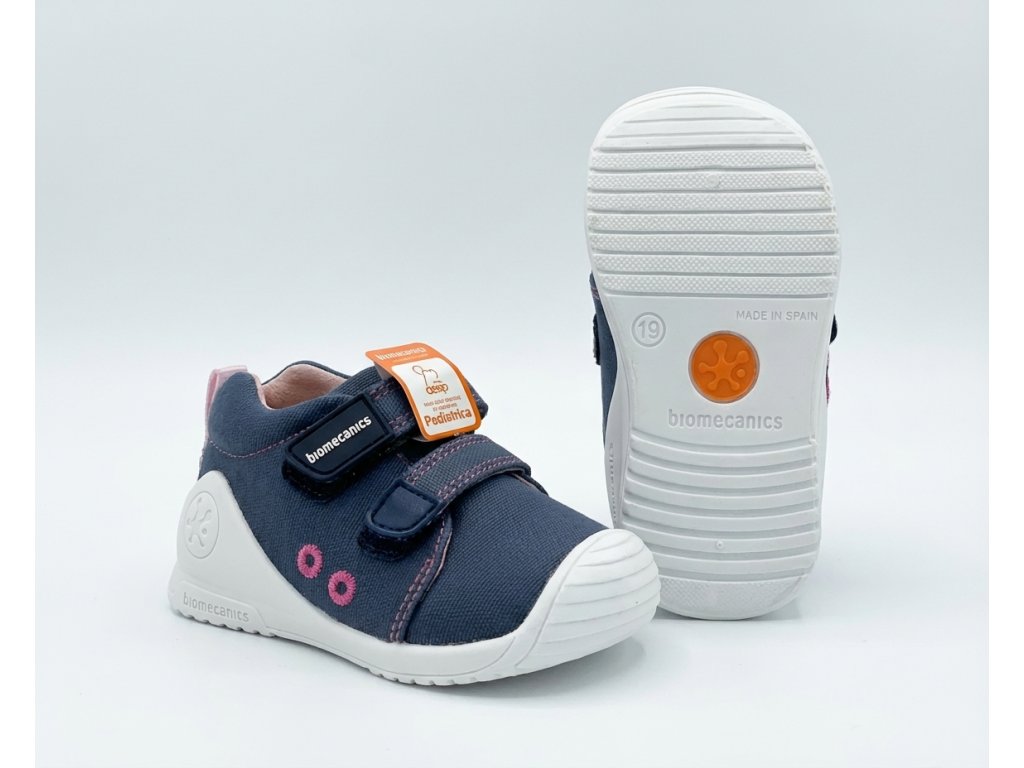 Dětské boty Biomecanics 222177-A v textilní variantě vhodné na jaro a léto. Vynikají opravdu příkladným zpracováním a patentovaným opatkem. Speciální Biomecanics opatek je za achilovkou snížený a neomezuje tak přirozený pohyb nohy, přičemž stále plní svoji funkci a zabraňuje tak vtáčení paty - šmajdání.